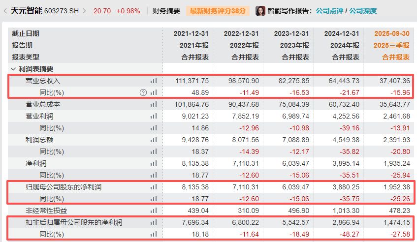 每经记者注意到,天元智能过去数年来业绩波动较大。2022年—2024年,公司营收、归母净利润和扣非净利润已经连续三年出现下滑。2025年前三季度,公司营收和归母净利润分别同比下滑15.96%和25.26%。