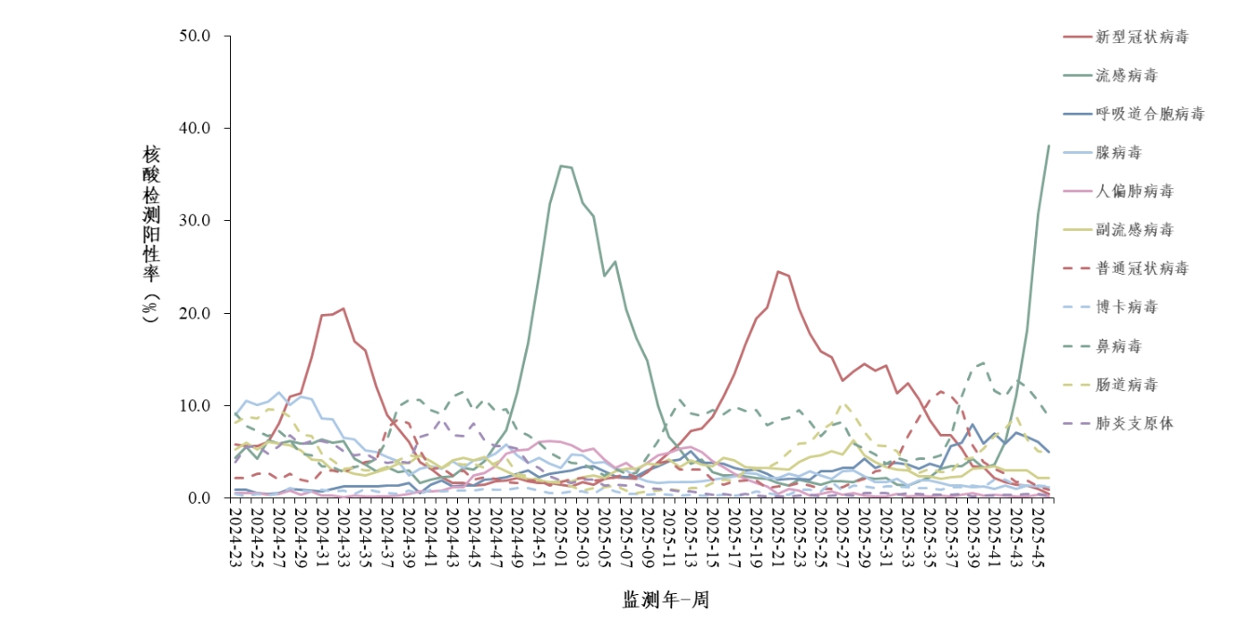 全国多地流感活动进入上升期,根据中国疾病预防控制中心全国急性呼吸道传染病哨点监测情况(2025年第46周),全国哨点医院门急诊流感样病例呼吸道样本检测阳性率前三位病原体为流感病毒(38.1%)、鼻病毒(8.8%)、呼吸道合胞病毒(5.0%)。