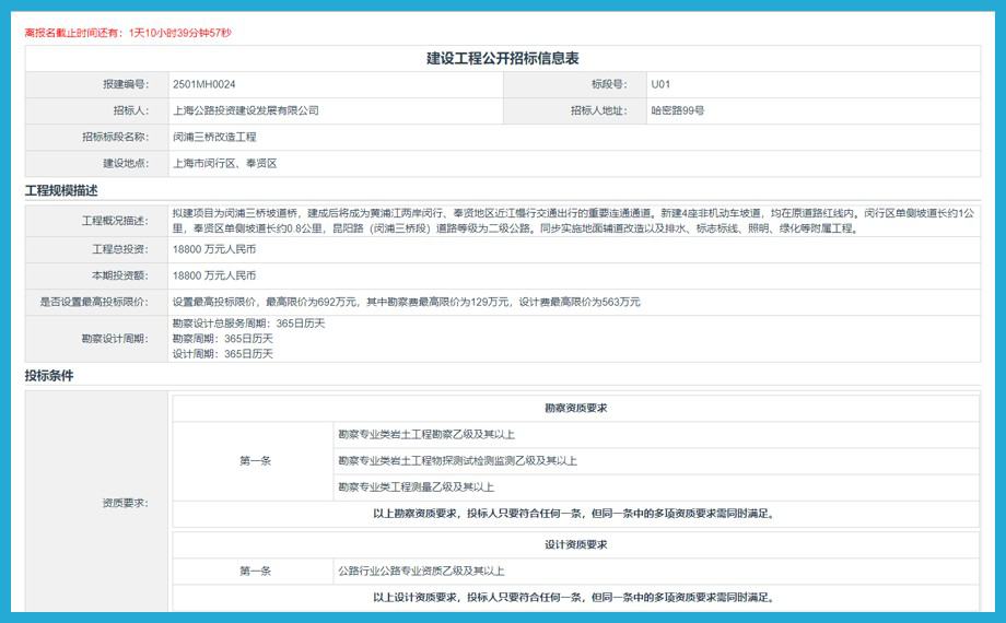 闵浦三桥改造工程“建设工程公开招标信息表”