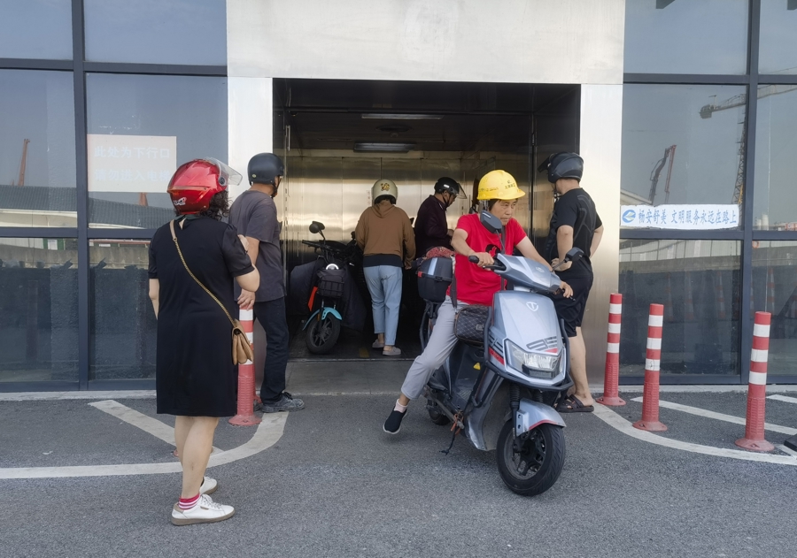 记者走访看到,出于安全考虑,大桥管理方要求搭乘电梯的市民,必须人车分离:每部电梯载6辆非机动车(要求熄火),人则搭乘另一部。6名骑手将电动自行车先后送入轿厢,需1分多钟。然后骑手换乘其他电梯,约1分20秒后上行到底,再排队取车。