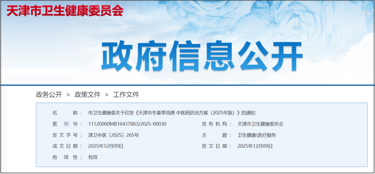 为充分发挥中医药在流感防治中的重要作用,近日,天津市卫生健康委员会印发《天津市冬春季流感中医药防治方案(2025年版)》。该方案为结合天津地域气候和近期流感病例的特点研究制定,针对成人和儿童提供中医诊疗及预防指导。