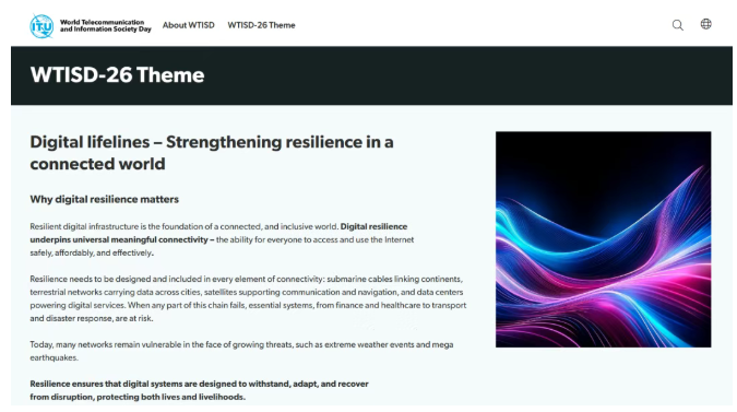 今日,国际电信联盟(ITU)公布了2026年世界电信和信息社会日主题“数字生命线——在互联世界中加强复原力”(Digital lifelines–Strengthening resilience in a connected world)。