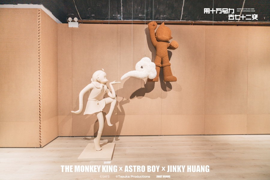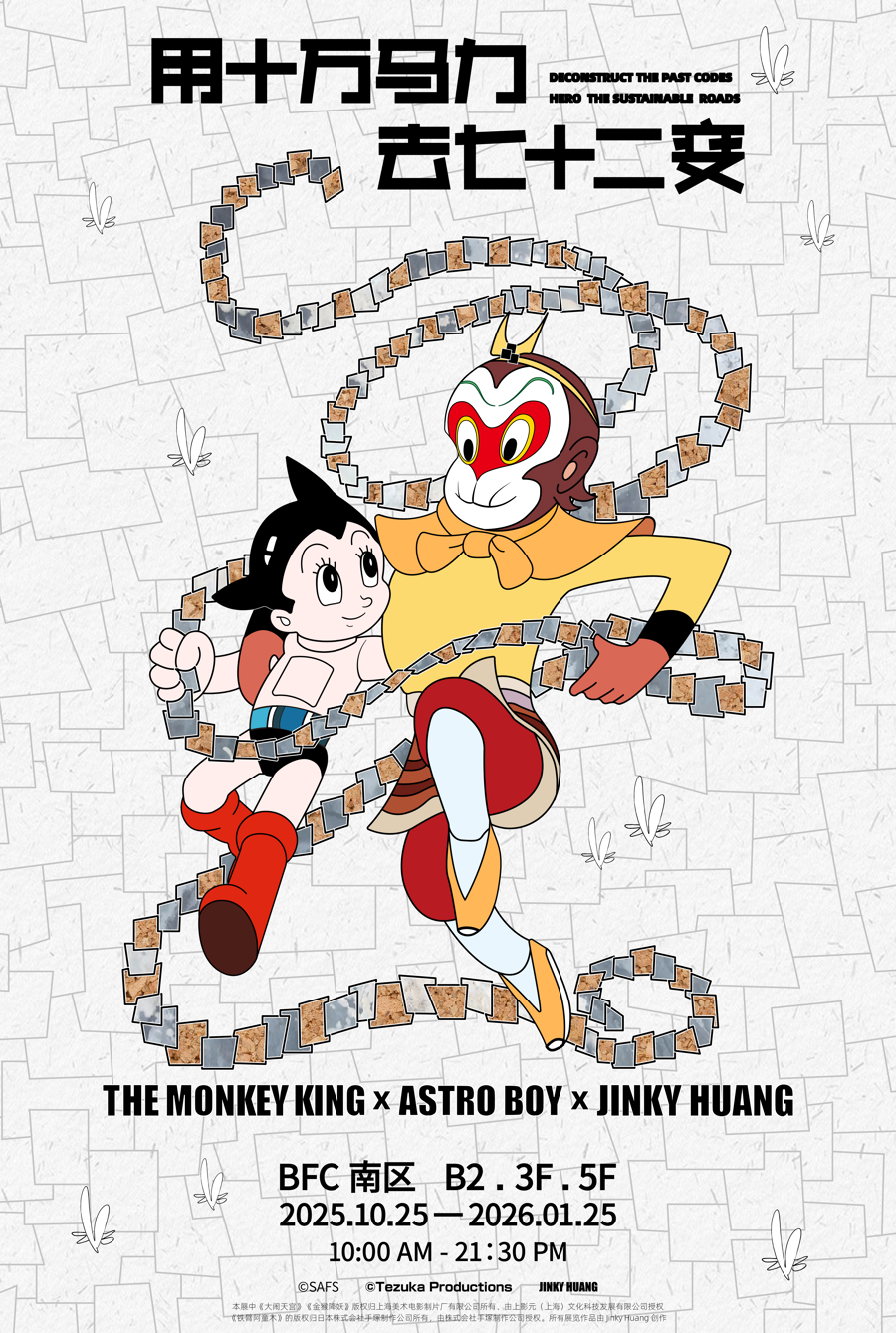如今,这场展览以深厚的文化渊源为纽带,在当代艺术语境中续写经典IP的对话新篇。展览主题中,“七十二变”象征着孙悟空所代表的无穷创造力,“十万马力”则象征阿童木的科技动能。二者的结合,不仅寓意着以科技力量驱动文化创新,更旨在打破经典与潮流、传统与当代之间的界限。在这一框架下,艺术家黄小眠以“可持续艺术”理念对两大IP进行视觉解构与美学重塑,将两位跨越数十年文化渊源的英雄形象置于当代议题的视野中,赋予其关注环保反思、科技创新与人文共生的新时代使命,完成了IP从形象再生到精神续写的升华。